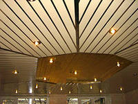 Строгие формы и различная ширина панелей позволяют создавать универсальные плоские формы. Реечный потолок немецкого дизайна выполняется с открытыми (или с закрытыми) стыками."